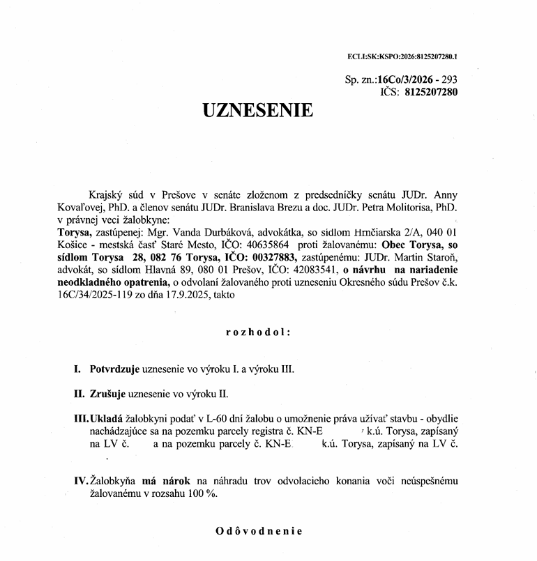 Krajský súd uznesením zo dňa 23. februára 2026 potvrdil neodkladné opatrenie nariadené Okresným súdom Prešov. Súdy ním uložili obci Torysa povinnosť zdržať sa zbúrania príbytku rómskej rodiny z marginalizovanej komunity. Svojím rozhodnutím tak odvolací súd potvrdil ochranu našej klientky a jej rodiny pred núteným vysťahovaním bez bytovej náhrady.